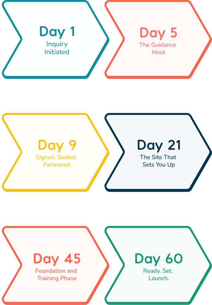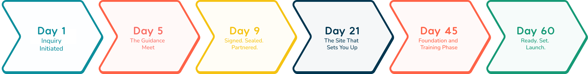 You enter a structured onboarding journey beginning with a guidance meet, followed by evaluation, agreement, setup planning, training, and launch milestones.
